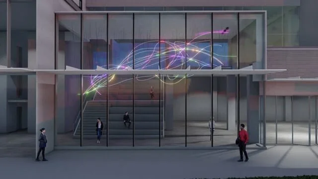 Seeing you seeing: colour wheel, utilizes the atmospheric condition of colour, light, and shadow to define space and to demarcate our incomplete partition of the everyday. As the ambient light of day rises and falls through the vestibule windows lighting the sculpture, so do the conditions by which we experience it change. We catch ourselves in this orchestration. The coloured glass of the artwork becomes both a cinematic collector and distributor as it captures reflected images moving across its surface and throws saturated patches of spectral light waves here and there into the architectural arena.